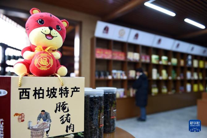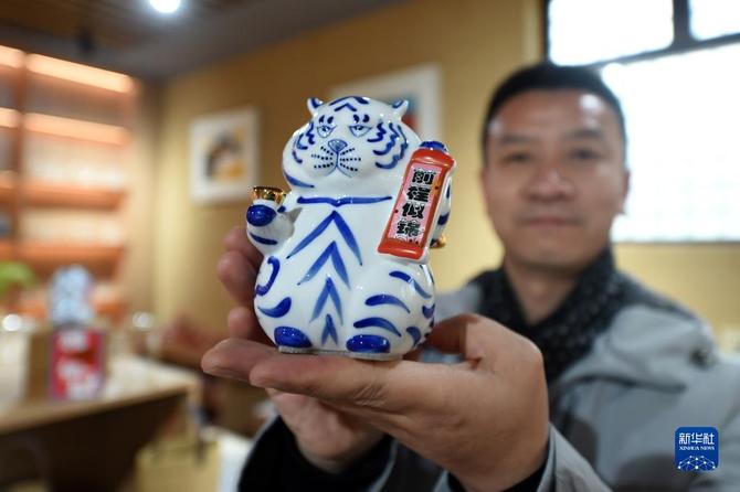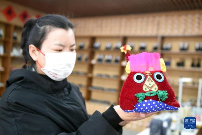 1月28日,在河北省平山县西柏坡镇北庄村西柏坡文创馆,工作人员展示特色文创产品。新华社记者 骆学峰 摄