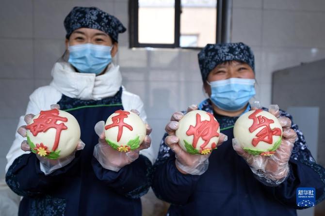 1月28日,在河北省平山县西柏坡镇北庄村团结食堂,工作人员展示制作的特色面食。新华社记者 骆学峰 摄