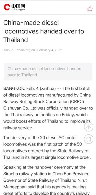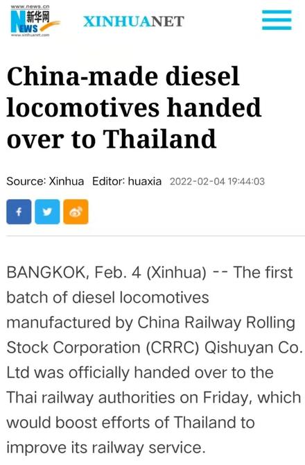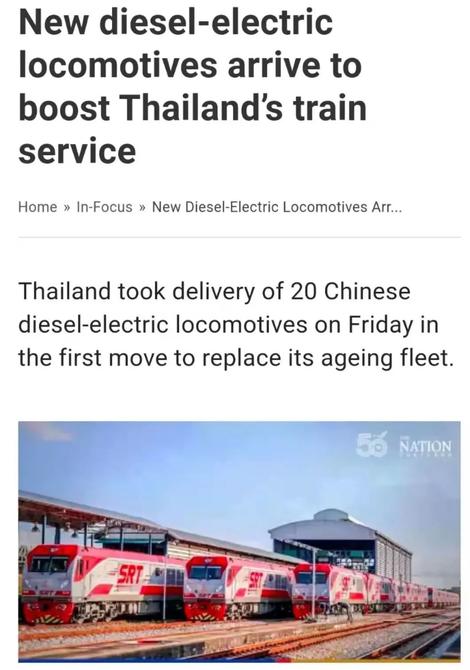 2020年8月31日,中国中车与泰国国家铁路局50台交流传动内燃机车合同正式签署,该项目是泰国铁路历史上最大的单笔整车订单。