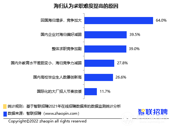 近几年,国内海归优先的职位数持续减少,2019年、2020年、2021年的同比增幅分别为-25.4%、-23.5%、-0.4%。回国求职海归人数增多,海归优先职位减少,一增一减使得海归在国内的求职压力加大。2021年的调研显示,83.1%的海归认为在国内求职难度提高,第一原因是“回国海归增多,竞争加大”(占比64%),第二原因是“国内企业对海归偏好减弱”(占比39.5%)。