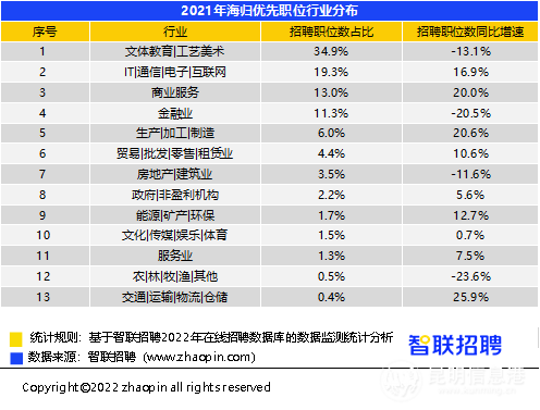 文体教育行业海归优先职位占比最高,为34.9%。IT互联网、商业服务、金融业对海归的需求量也较大,海归优先职位分别占19.3%、13%、11.3%。受“双减”政策影响,2021年教培业招聘需求骤降,文体教育行业的海归优先职位同比减少13.1%。相对而言,IT互联网、商业服务行业海归岗位均同比增长15%以上,这对正在求职的海归来说是不错的选择。