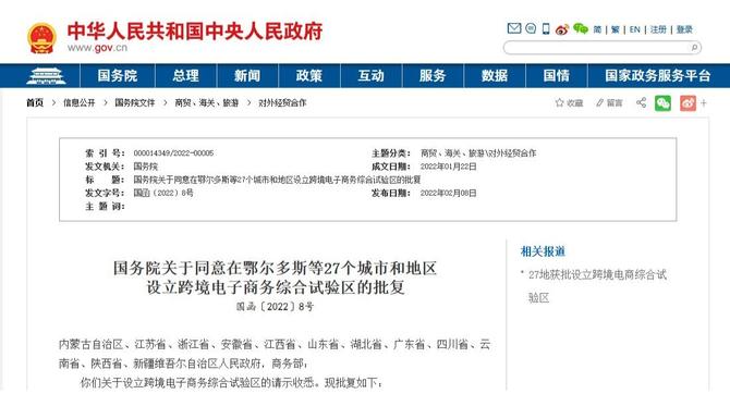 央广网北京2月9日消息 据中国政府网8日消息,国务院发布关于同意在鄂尔多斯等27个城市和地区设立跨境电子商务综合试验区的批复(以下简称“批复”)。