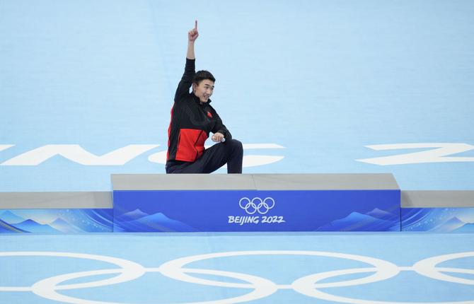 高亭宇比出“第一”的手势,咧嘴笑了。他高举五星红旗环绕全场,朝观众席大喊了一声,宣泄心中的激情。“我爱你中国,亲爱的母亲……”音乐响起,亮丽的中国红在“冰丝带”飘扬。