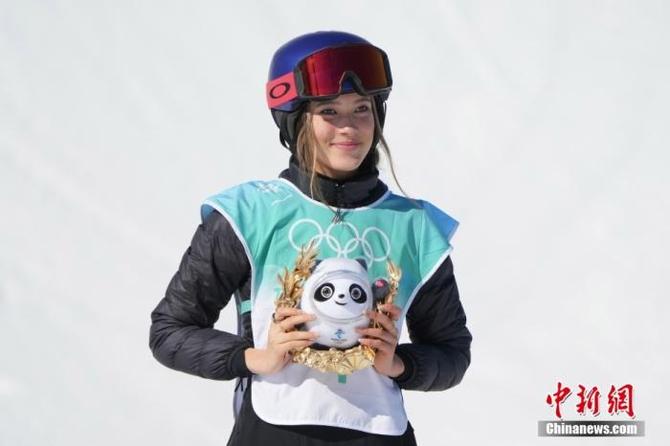 谷爱凌在颁发纪念品仪式上手持冰墩墩庆祝。 中新社记者 毛建军 摄
