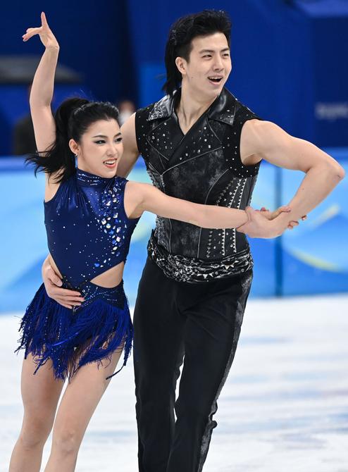 2月12日,中国选手王诗玥(左)/柳鑫宇在北京冬奥会花样滑冰项目冰上舞蹈韵律舞比赛中。新华社记者马宁摄
