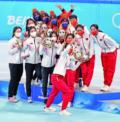 2月13日,北京2022年冬奥会短道速滑项目女子3000米接力决赛中,中国队获得季军。图为冠军亚军季军选手在颁发纪念品仪式上手握冰墩墩合照自拍。光明日报 记者郭红松摄/光明图片