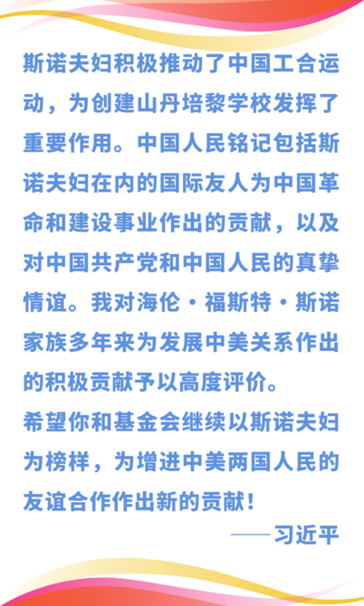 习近平指出,斯诺夫妇积极推动了中国工合运动,为创建山丹培黎学校发挥了重要作用。中国人民铭记包括斯诺夫妇在内的国际友人为中国革命和建设事业作出的贡献,以及对中国共产党和中国人民的真挚情谊。我对海伦·福斯特·斯诺家族多年来为发展中美关系作出的积极贡献予以高度评价。