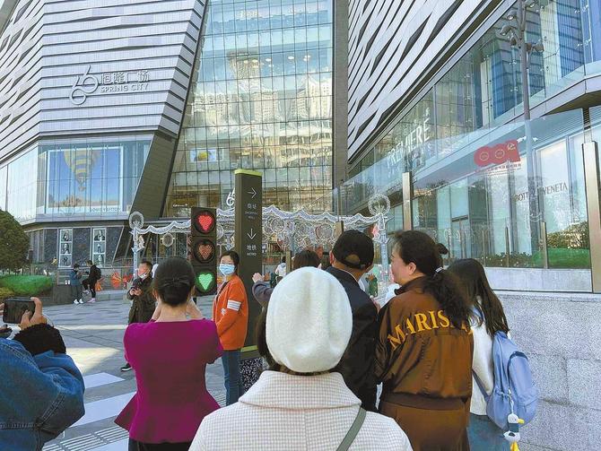 也有很多情侣来到现场打卡。韩女士告诉记者,“2·14”是个比较有意义的日子,特地和男朋友穿着情侣装出来。“这里的‘爱心红绿灯’很浪漫,过来拍几张情侣照。”