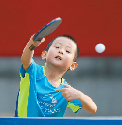 小朋友们利用课余时间,参加各种体育活动,体验运动乐趣。图为一名小朋友在山东省滕州市弘道公园打乒乓球。