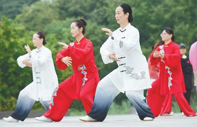 中老年人越来越注重健康生活,享受运动乐趣。图为安徽省阜阳市的太极拳爱好者在公园内练习太极拳。