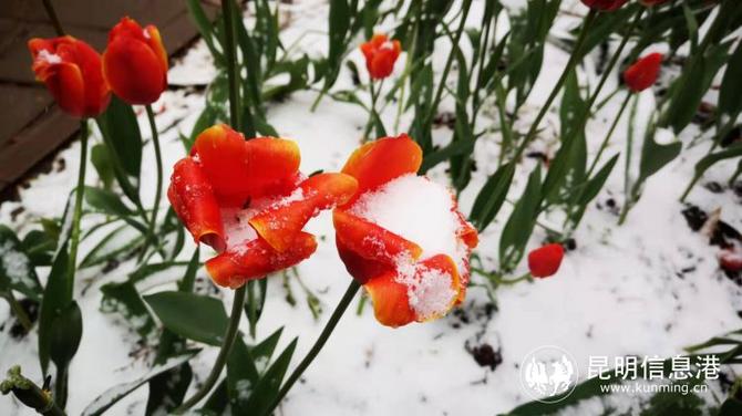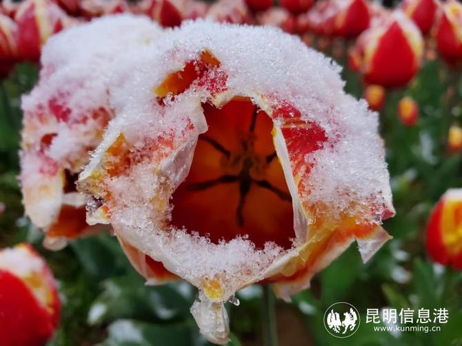 位于昆明滇池国家旅游度假区的捞渔河湿地公园内,郁金香在雪中绽放。