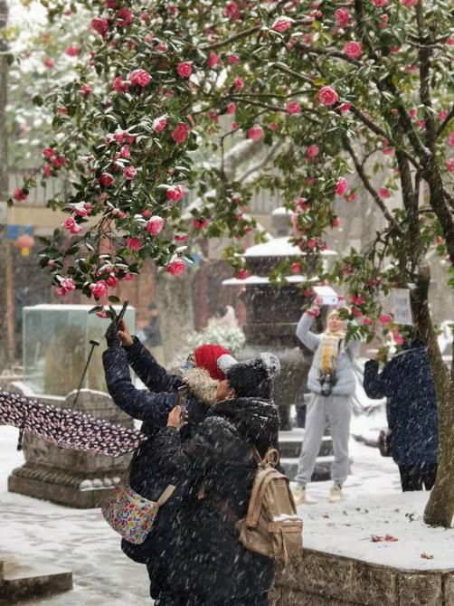 西山华亭寺内,盛放的山茶花姹紫嫣红,与皑皑白雪构成最美景致,一大早便吸引了游客及市民纷纷前来赏雪。但是受冰雪天气影响,西山风景区大面积道路冰凌,目前景区暂停对外开放,环保大巴暂停发车,建议登山市民暂不入山。