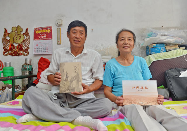 △杨玉芳(左)、高志宏(右)夫妇在家中展示他们所写的书。
