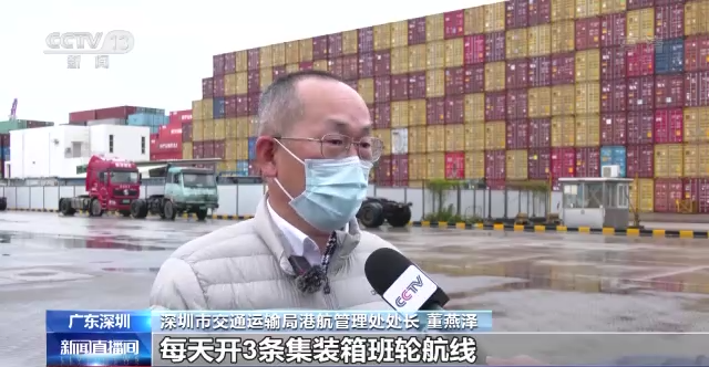 深圳市交通运输局港航管理处处长 董燕泽:3个集装箱港区计划每天开3条集装箱班轮航线,这样总体1天最少可以满载360个集装箱,来分流陆路的跨境运输压力。航线被广大客户认可之后,运量还可以继续加大,我们港口是有能力来组织运力,来保证深港的跨境运输。