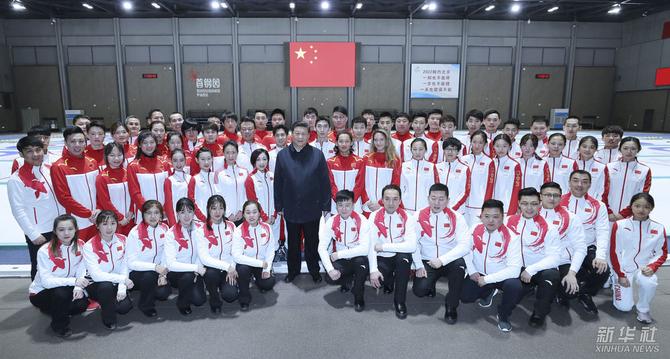 2019年2月1日,习近平在北京看望慰问基层干部群众,考察北京冬奥会、冬残奥会筹办工作。这是1日下午,习近平在位于首钢园的国家冬季运动训练中心勉励正在训练备战的运动员、教练员,并同他们合影。