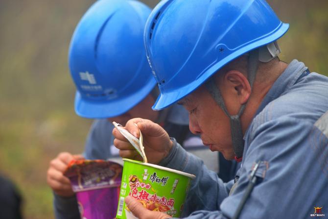 彼时已是下午三点,作业结束,现场的电力抢修工人才在山上草草吃上一顿已经冷透的饭。据相关电力抢修人员介绍,近两天作业到两三点吃上早饭或是吃点干粮已经是很好了,前些天大家都是一顿早点“管”一天。