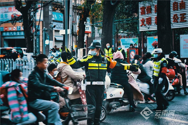 2月28日,刘波在一二一大街维护交通秩序。昆明市公安局交警支队供图