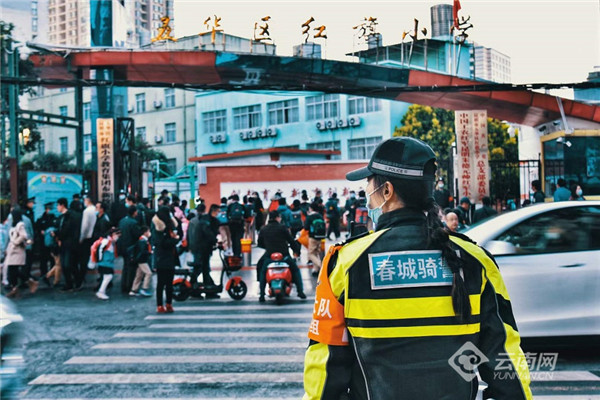 2月28日,昆明市公安局交警支队巡逻大队女子骑巡队员在红旗小学护学岗疏导交通。昆明市公安局交警支队供图