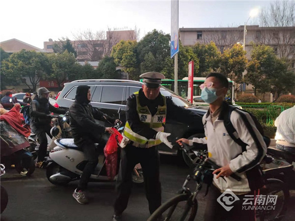 2月28日,马会坤在一二一大街护送孩子平安进学校。昆明市公安局交警支队供图