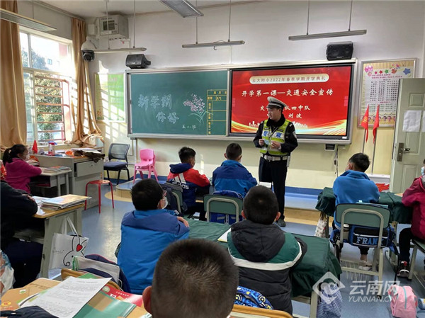 2月28日,昆明市公安局交警支队各大队民警走进校园,为孩子们讲授“开学第一课”,将交通安全知识和理念传递给孩子们。昆明市公安局交警支队供图