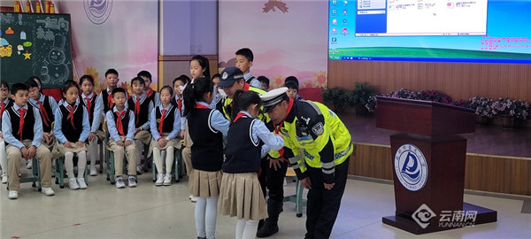 2月28日,刘波在云大附小为学生上交通安全宣讲课。昆明市公安局交警支队供图