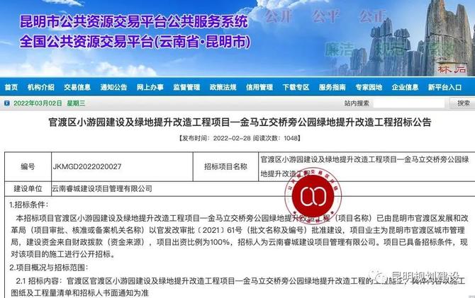 3月2日,昆明市公共资源交易平台发布《官渡区小游园建设及绿地提升改造工程项目—金马立交桥旁公园绿地提升改造工程招标公告》。