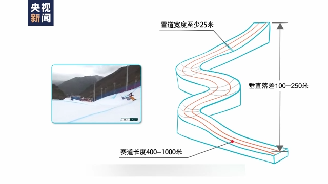 单板滑雪坡面回转赛道场地为不规则地形,有适当斜坡;垂直落差在100米到250米之间,赛道长度在400米到1000米之间,雪道宽度至少25米,赛道宽度至少4米,平均坡度15度左右。障碍追逐赛道垂直落差在100米至250米之间,赛道长度在500至1000米之间;雪道宽度40米,赛道宽度为10米,平均坡度12度左右。