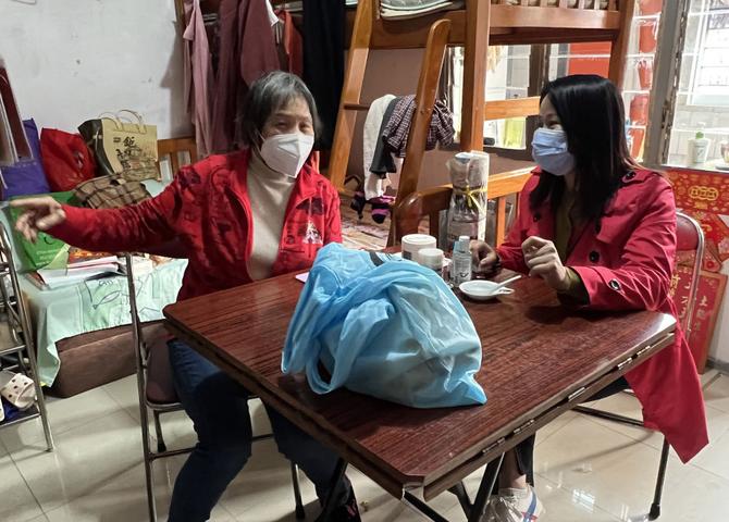 义工傅顺芳(右)到市民家中派送防疫物资(资料照片)。新华社发