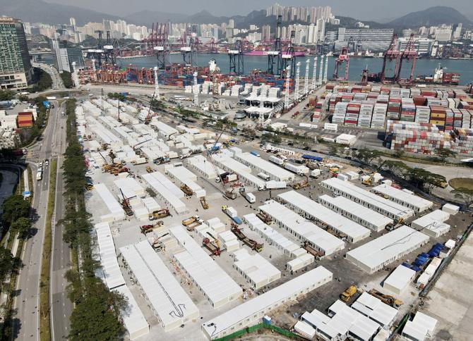 3月1日晚7时,中央援建香港的青衣方舱医院正式交由香港特区政府营运,并接收首批无症状或轻症新冠肺炎确诊患者。图为2月26日拍摄的青衣方舱医院(无人机照片)。新华社发