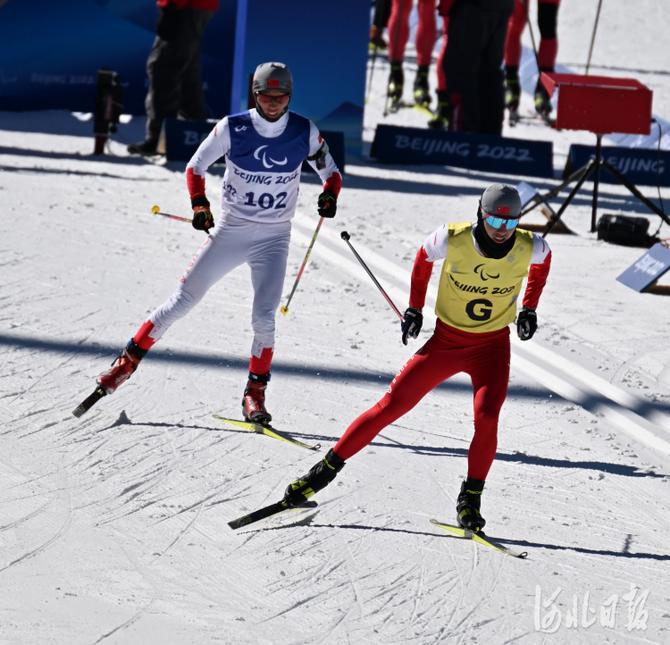 2022年3月5日,中国选手党鹤松(左)和引导员秦海洋在比赛中。当日,北京2022年冬残奥会残奥冬季两项男子短距离(视障)比赛在国家冬季两项中心举行。中国选手党鹤松获得第8名。河北日报记者 贾恒 摄