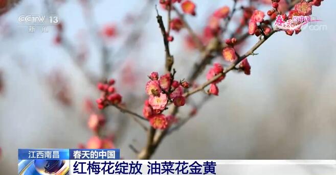 阳春三月,草长莺飞。在江西南昌凤凰沟梅园,明媚春光下,上百亩1000多株红梅竞相绽放,层层叠叠,灿若红霞,染红了乡野,释放出沁人心脾的幽香。梅花树下点缀着金灿灿的油菜花,相得益彰,构成了一幅绝美的春日美景图。