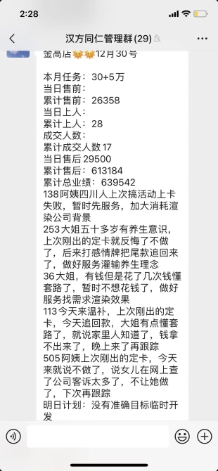 但方芳不知道的是,此类“关怀”不过是销售前的“服务消耗”。 黄文敏实控的虹口区广粤路一家门店的内部员工业绩群信息显示,每日下班后,每名员工都需要在群里汇报当日接待顾客的情况。顾客们被标记为数字代号,没有姓名。汇报的方式包括:消耗热情服务、了解客人情况等,甚至还会明确记录下客人的家庭信息,子女状况等。