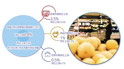美国劳工部3月10日公布的数据显示,美国2月份居民消费价格指数(CPI)环比上涨0.8%,同比上涨7.9%,创1982年1月以来最大同比涨幅。美国2月份CPI环比和同比涨幅均较1月份明显扩大,表明美国通胀率继续强势上扬,美联储之前的分析预判和有关降温措施不够精准有力。美国面临两难抉择,既想确保经济增长,又要抑制通胀,通胀率在年内实现软着陆目标难度较大。
