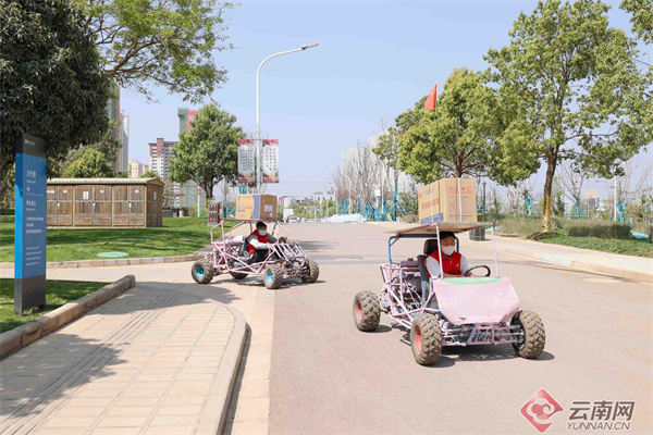 近日,在云南工商学院的校园里出现了一种简易的小车,这些小车由学生驾驶,每天往返于学院应急管理指挥中心和保卫处之间,帮助学校工作人员运送防疫物资。据介绍,这些小车出自学校智能科学与工程学院车辆工程专业的同学之手,学生们自发将专业课上制造的小车运用到了学校防疫工作中。