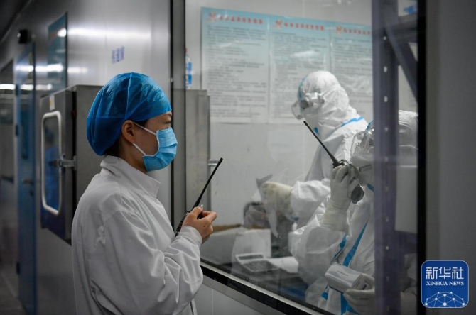 3月19日,在天津市河北区城市核酸检测基地内,PCR检测室组长马晋(左)通过对讲机与实验室内的工作人员沟通。(新华社记者孙凡越摄)
