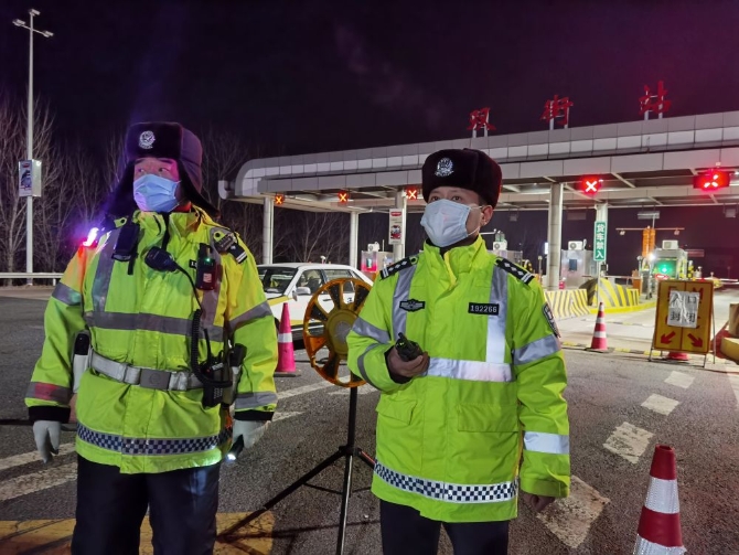张杨(右)在高速公路卡口值守。(受访者供图)