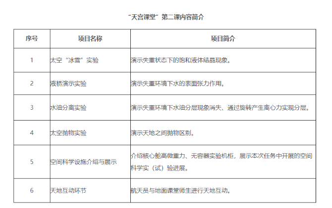 本次太空授课活动继续采取天地对话方式进行,由航天员在轨演示太空“冰雪”实验、液桥演示实验、水油分离实验、太空抛物实验,介绍与展示空间科学设施(授课内容介绍附后),旨在传播普及空间科学知识,激发广大青少年不断追寻“科学梦”、实现“航天梦”的热情。