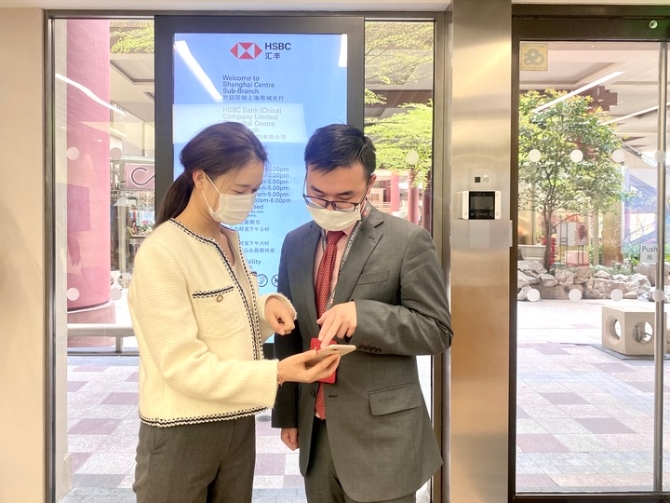 3月24日,汇丰上海商城支行员工在讨论当日工作安排。网点在满足防疫的要求下,继续保持正常运转,并确保手机银行的稳定服务。受访者供图