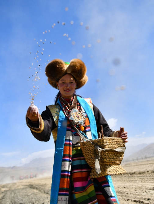 村民在西藏日喀则市江孜县努康村参加春耕仪式时播撒种子(3月16日摄)。新华社记者 晋美多吉 摄