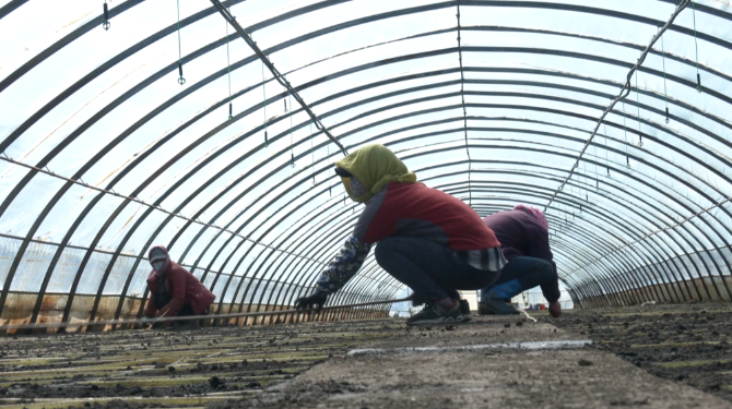 在黑龙江省五常市一水稻育苗大棚内,农民们正在忙碌。(受访者供图)
