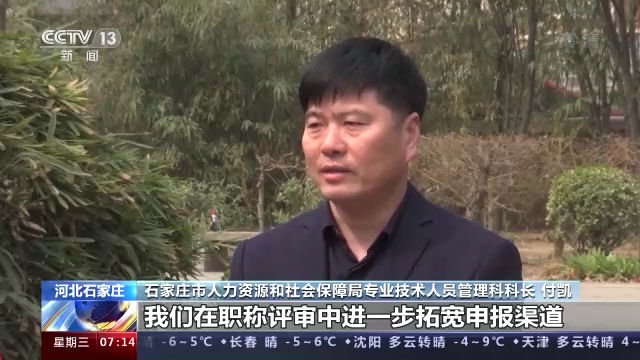 石家庄市人力资源和社会保障局专业技术人员管理科科长 付凯:我们在职称评审中,进一步拓宽申报渠道。对高校毕业生职称认定从原来一年一次的集中初聘认定,改为现在一月一次的考核认定,实现人才职称的即报即审,对稳定高校毕业生就业起到了保障作用,使得人才引得来,留得住。(总台央视记者梁丽娟 宋菀)