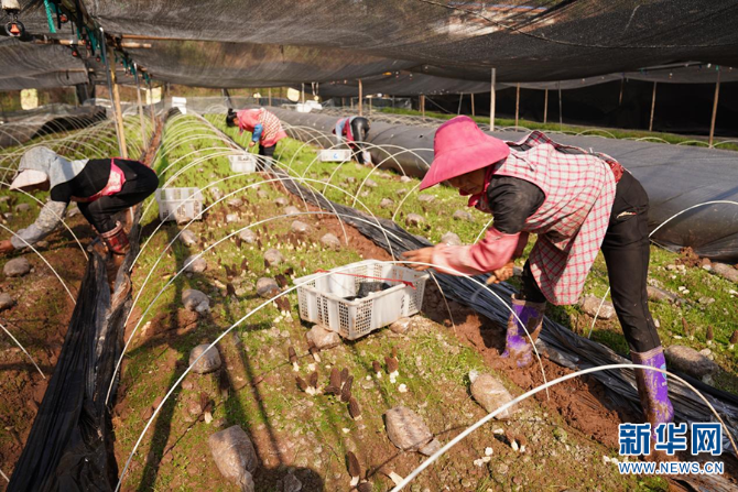 工人正在采收羊肚菌(摄于3月17日)。新华网发(牟定县融媒体中心供图)