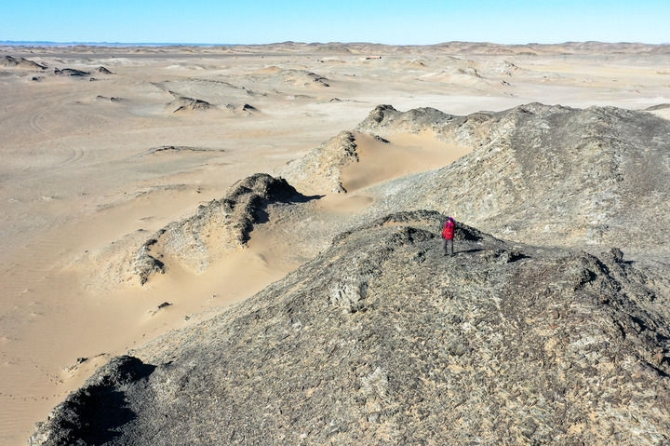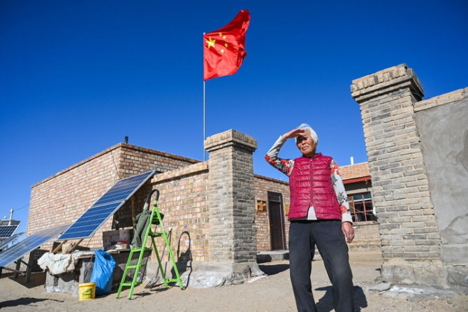 2021年1月,尼玛老人在戈壁石山上眺望边境线。 新华社记者 连振 摄