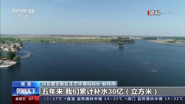 河北雄安新区生态环境局局长 赵宪伟:大规模地推进了生态清淤,我们利用南水北调的水,引黄水以及上游水库的水,强化对白洋淀的生态的补水。五年来,我们累计补水30亿(立方米)。