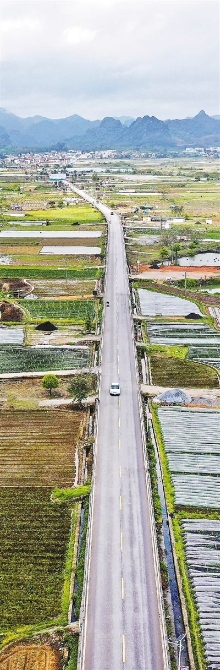 广西柳州市柳江区渡村至成团公路。公路与道路旁的稻田、农房相互映衬,构成了美丽的田园画卷。庞革平 黎寒池摄影报道