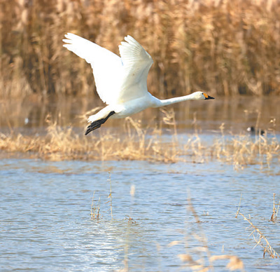 山东东营黄河三角洲湿地,一只天鹅在水上飞翔。周广学摄