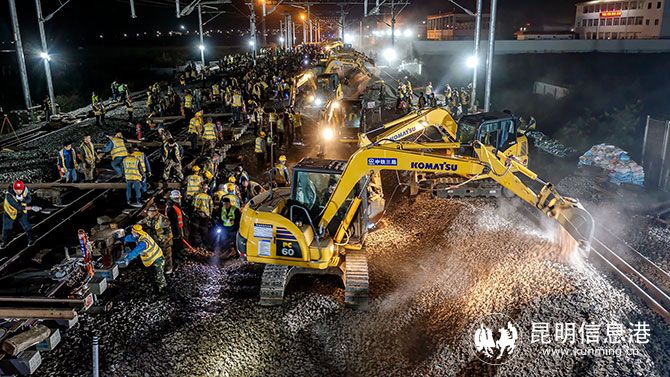 为了在规定的8小时内完成,中国铁路昆明局集团组织中铁三局、中铁电气化局等多家单位的1000多名施工人员,多次进行现场演练,反复优化施工方案,调集挖掘机、道岔台车等专业设备300多台,组建了9个专业班组,分工协作,避免了多单位、多工种、多工序交叉作业可能引发的问题。