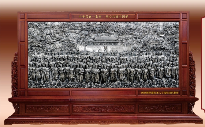 庆祝中华人民共和国成立70周年大型成就展时,北京民族文化宫一件珍贵展品吸引了人们的目光。这是寸发标制作的一件大型银雕屏风,屏风用传承千年的雕刻技法,栩栩如生刻画出56个民族112个鲜明的人物形象。他们在天安门前手挽手、肩并肩,四周是巍峨耸立的珠峰昆仑、云蒸霞蔚的三山五岳、绵延起伏的万里长城、奔流不息的长江黄河,展现出中华民族大团结的壮美景象。