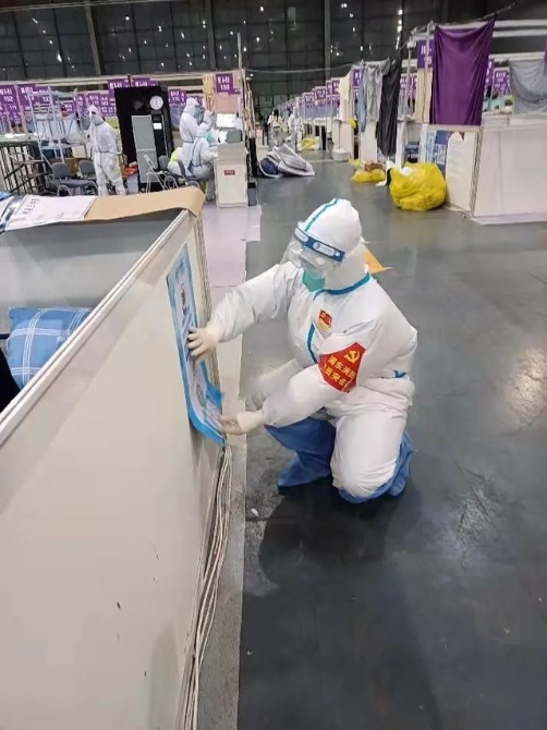 我主动申请进入人数最多、情况最复杂的H1舱,进舱后便第一时间投入工作。检查消防设施、紧急疏散通道、检查用电安全情况……舱内一圈下来,汗水早已湿透了衣服。可是想到自己的工作,我又觉得付出很值得。进舱的前三天,我组织张贴消防海报500余张,收缴大功率电器6个,组织清理违规搭建的床单30余处,为方舱的安全消除隐患,这是我的职责。进驻初期人员紧张,两天内我和同组的队员进舱18个小时,黑眼圈成了“标配”。包裹了两层防护服,身体体感异常闷热,为了不耽误工作,我们进舱前2小时就停止喝水,舱内闷热,汗水浸透衣服,嘴唇干裂难受,但我们都觉得再辛苦也值得,为了“小家”更为了“大家”。(记者李治国 摄影/周瑞)