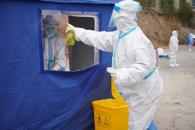 4月15日,在青海省西宁市城西区一处核酸采集点,防疫人员正在做消杀。(新华社记者 张子琪 摄)